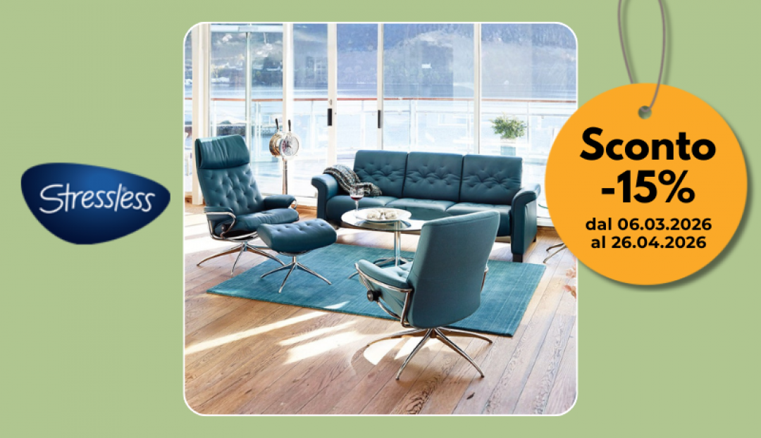 Dal 06 marzo al 26 aprile 2026, riceverai uno sconto del 15% su una selezione di poltrone, divani, sedie e sedie da ufficio STRESSLESS.